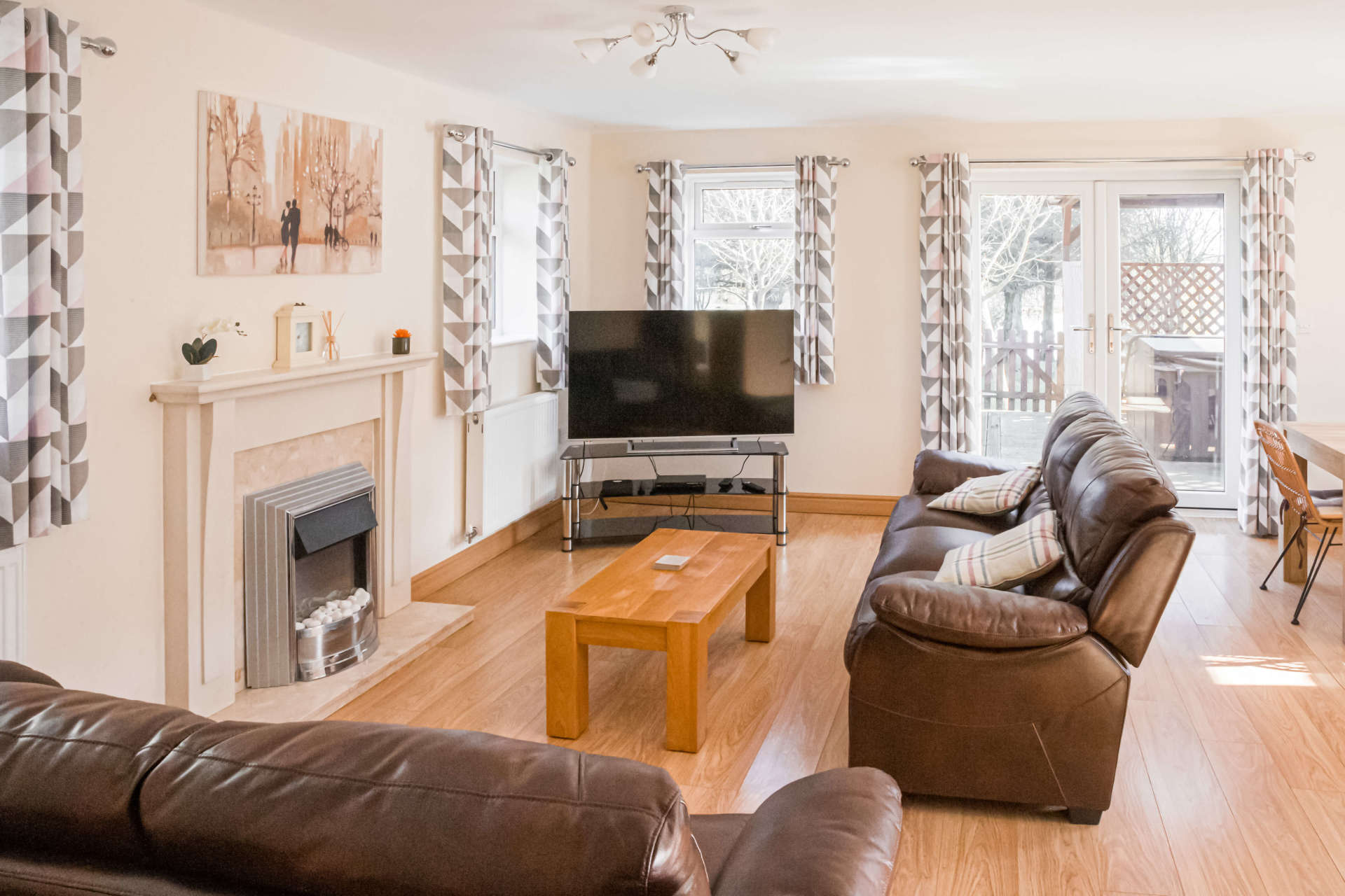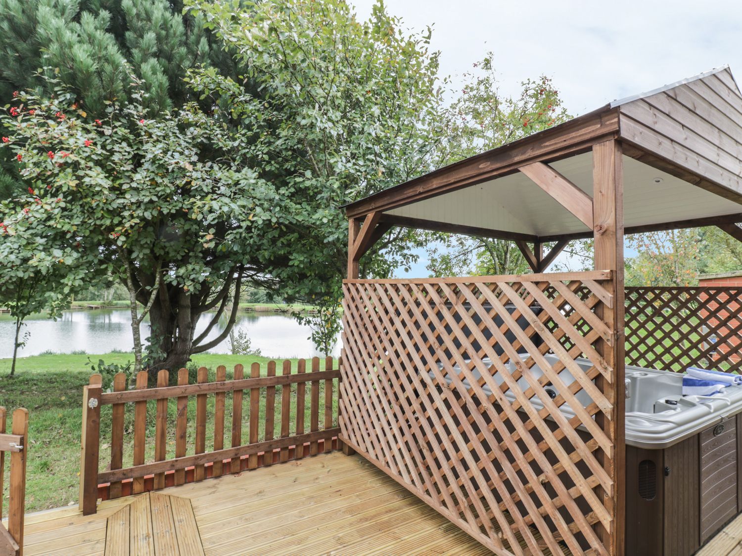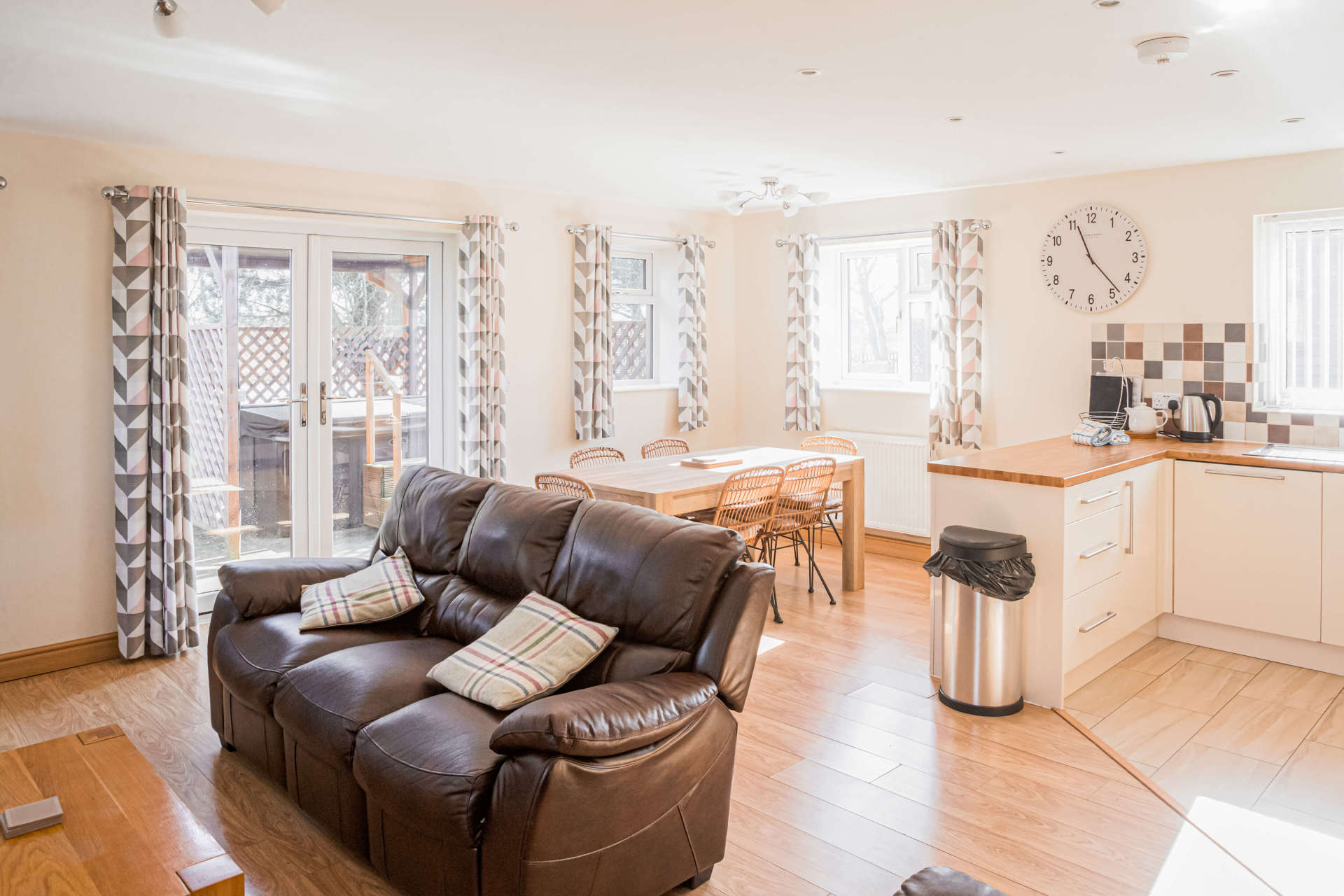 Step across the private decking of your wooden lodge and into the open-plan living space of this contemporary-styled property to find everything you could need.