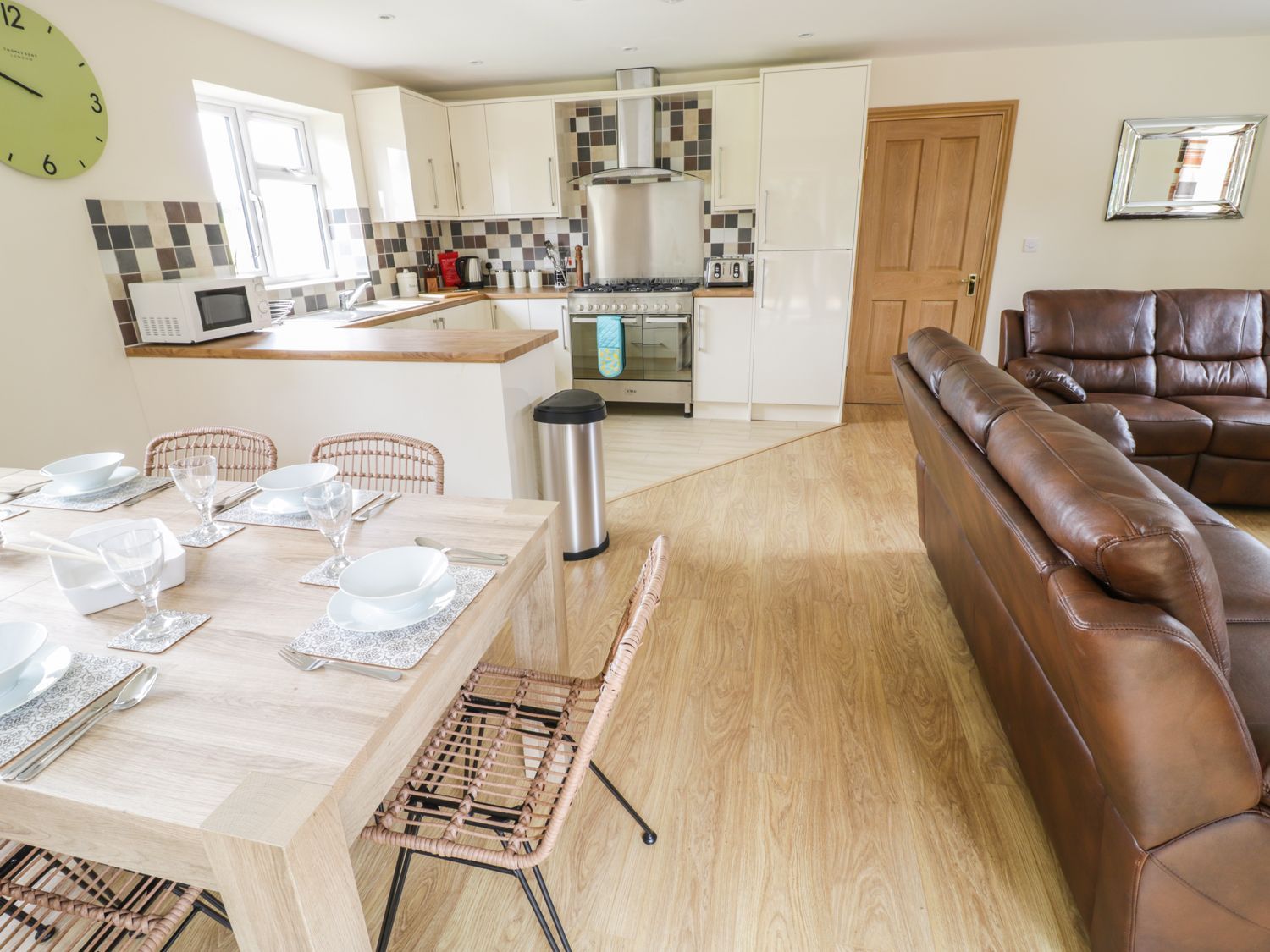 Enjoy some time relaxing in one of the plush leather sofas before stepping into the kitchen area to prepare a mouth-watering meal with the help of the good range of appliances on offer including a gas oven and hob, microwave, fridge/freezer and a dishwasher.
